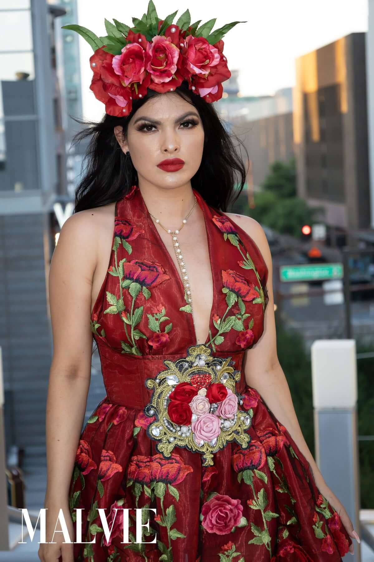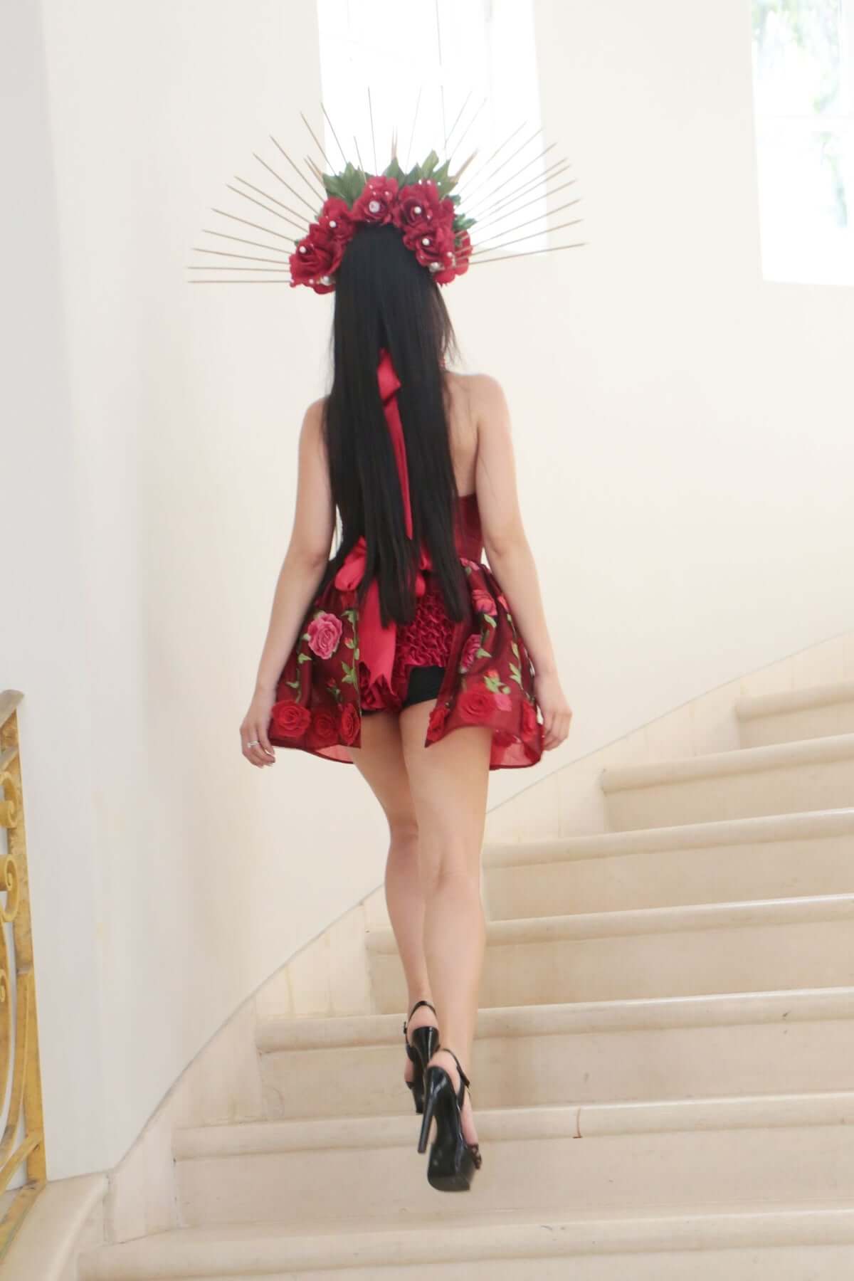 Brigitte, Beautiful embroidered black net over red silk organza with rose embellishments.