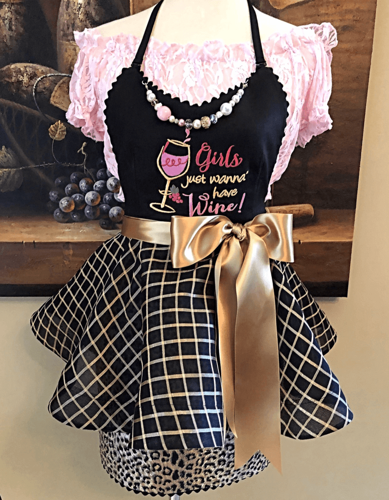 It's Fall and time for Girls and Wine gatherings. Host your next neighborhood wine tasting party wearing this beautiful Wine Apron only at Couture Aprons for every occasion. 100% Linen Bib with a gorgeous cotton thread embroidery and handcrafted detachable necklace. Peplum is made from 100% silk organza with a designer cotton canvas cheetah print underskirt. Simply outstanding Hostess Apron for all your Fall events where Wine is being served. We finish with a removable elastic neckband and double sided Gold Satin Ribbon Ties.
