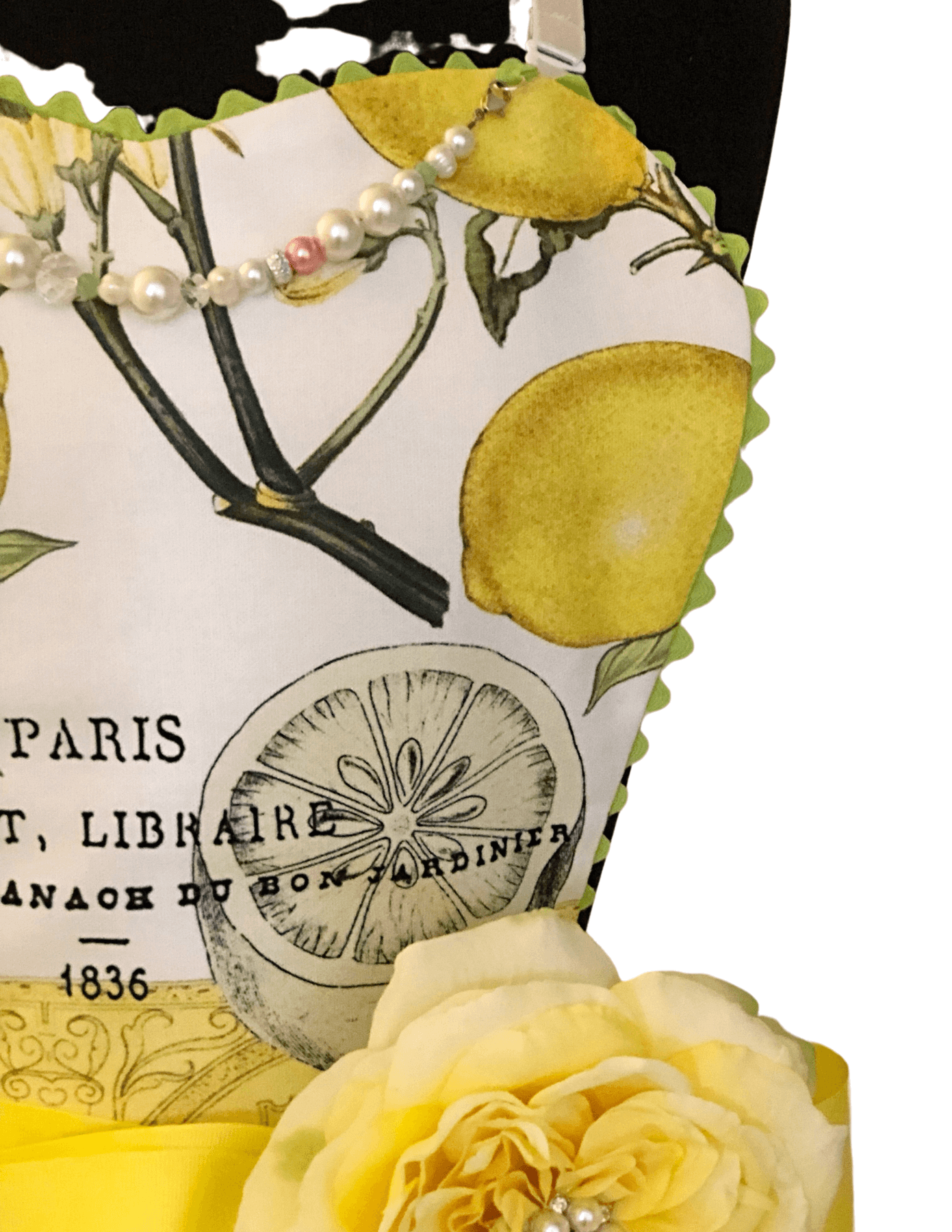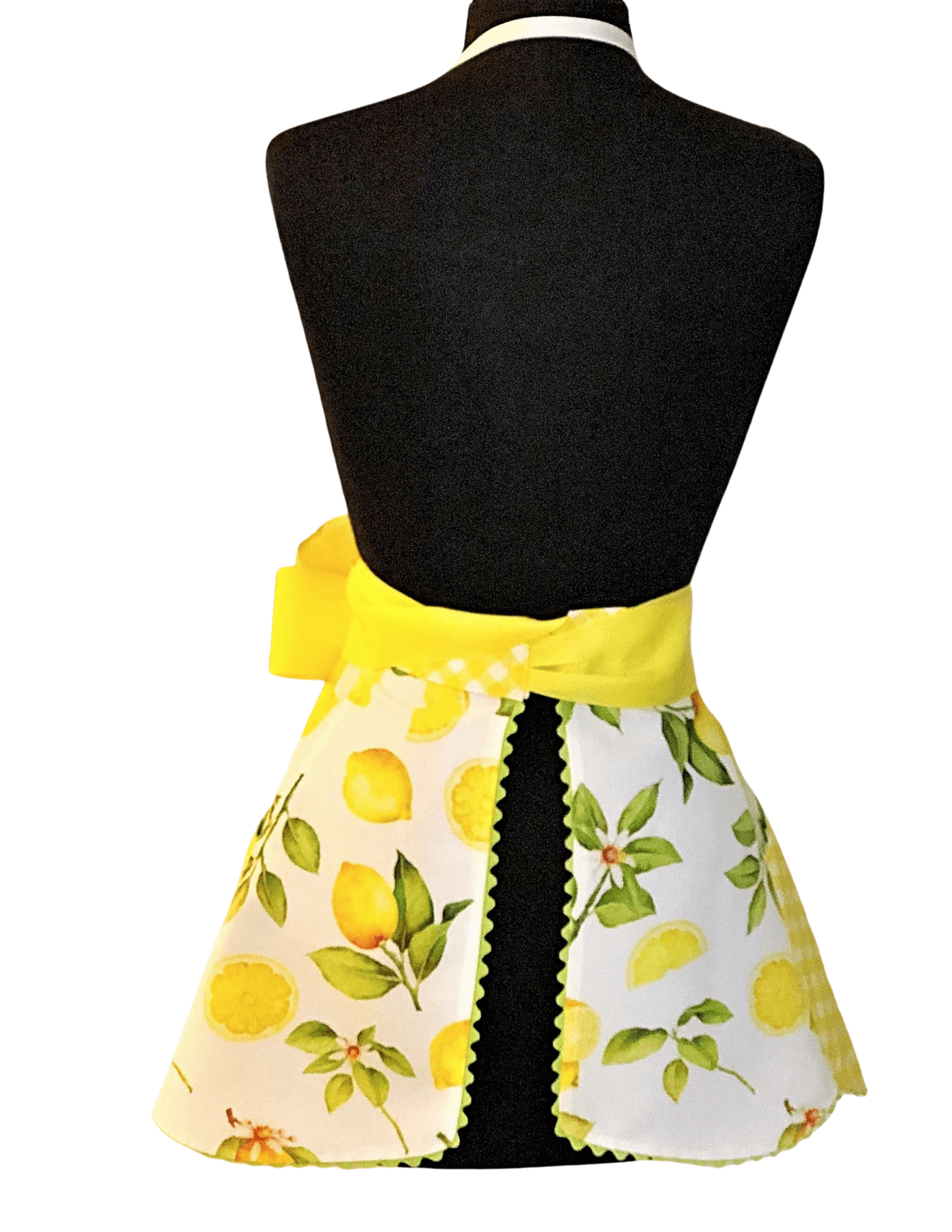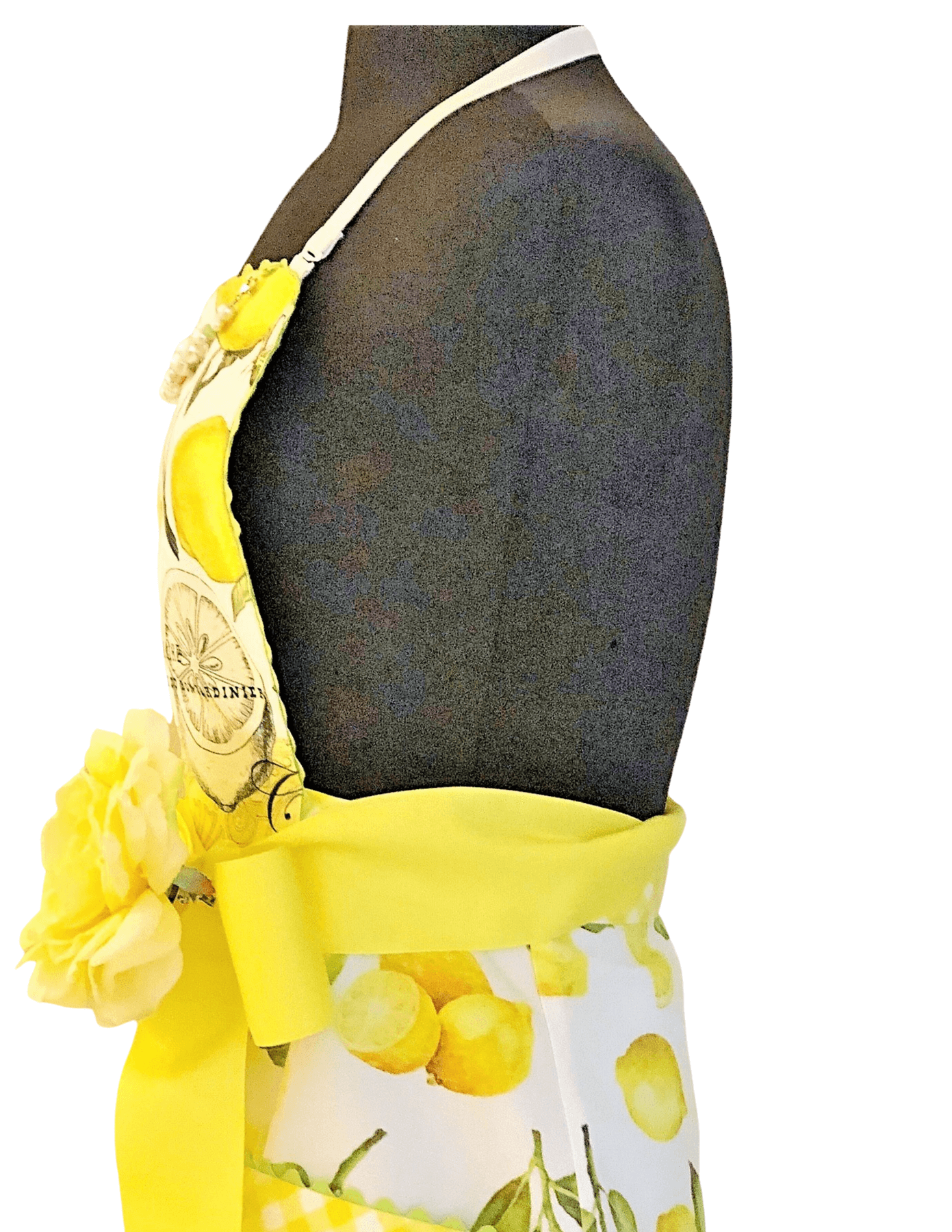 Yum Limoncello Apron is the perfect gift for the lady who enjoys making fresh lemonade from her garden tree. Deep pockets for tools and fruit. Beautiful 100% Cotton Canvas Lemon Botanical Print mixed with Gingham and Grosgrain Ribbon Ties. Detachable handcrafted beaded necklace and Floral Brooch to add Romance and Beauty. Lovely.