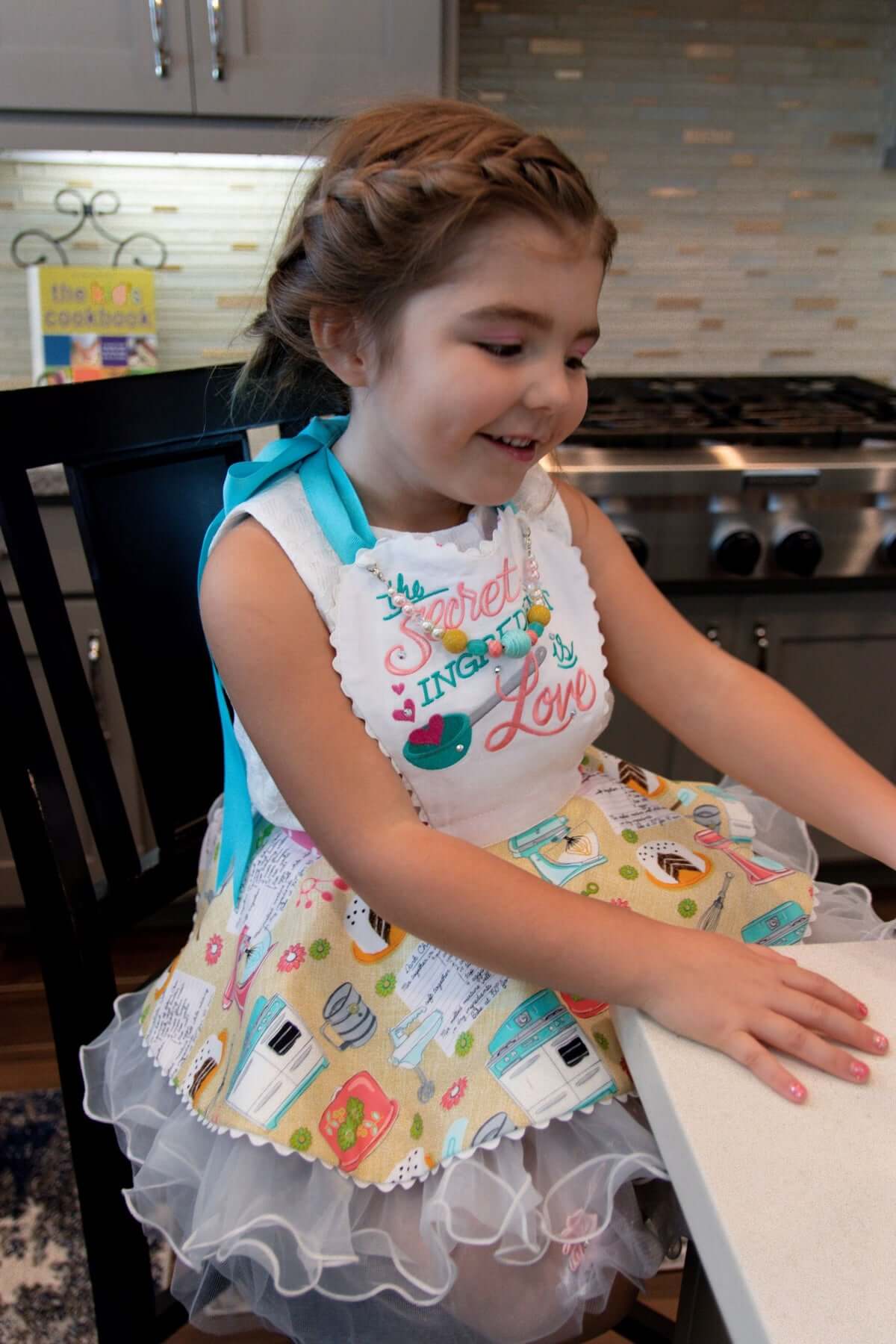 MOMMY AND ME APRON NOW AVAILABLE AT COUTURE APRONS FOR EVERY OCCASION. SWEET CHOCOLATE CAKE RECIPE WITH VINTAGE KITCHEN PRINT ON 100% COTTON FABRIC. ATTACHED IS A RUFFLED ORGANZA UNDERSKIRT, HANDCRAFTED DETACHABLE NECKLACE AND FLORAL BROOCH. BIB IS MADE FROM 100% LINEN AND WE'VE ADDED CRYSTALS FOR JUST THE RIGHT AMOUNT OF SPARKLE. NOTE: FLORAL BROOCH CAN BE USED AS A FLOWER HAIR CLIP TOO.