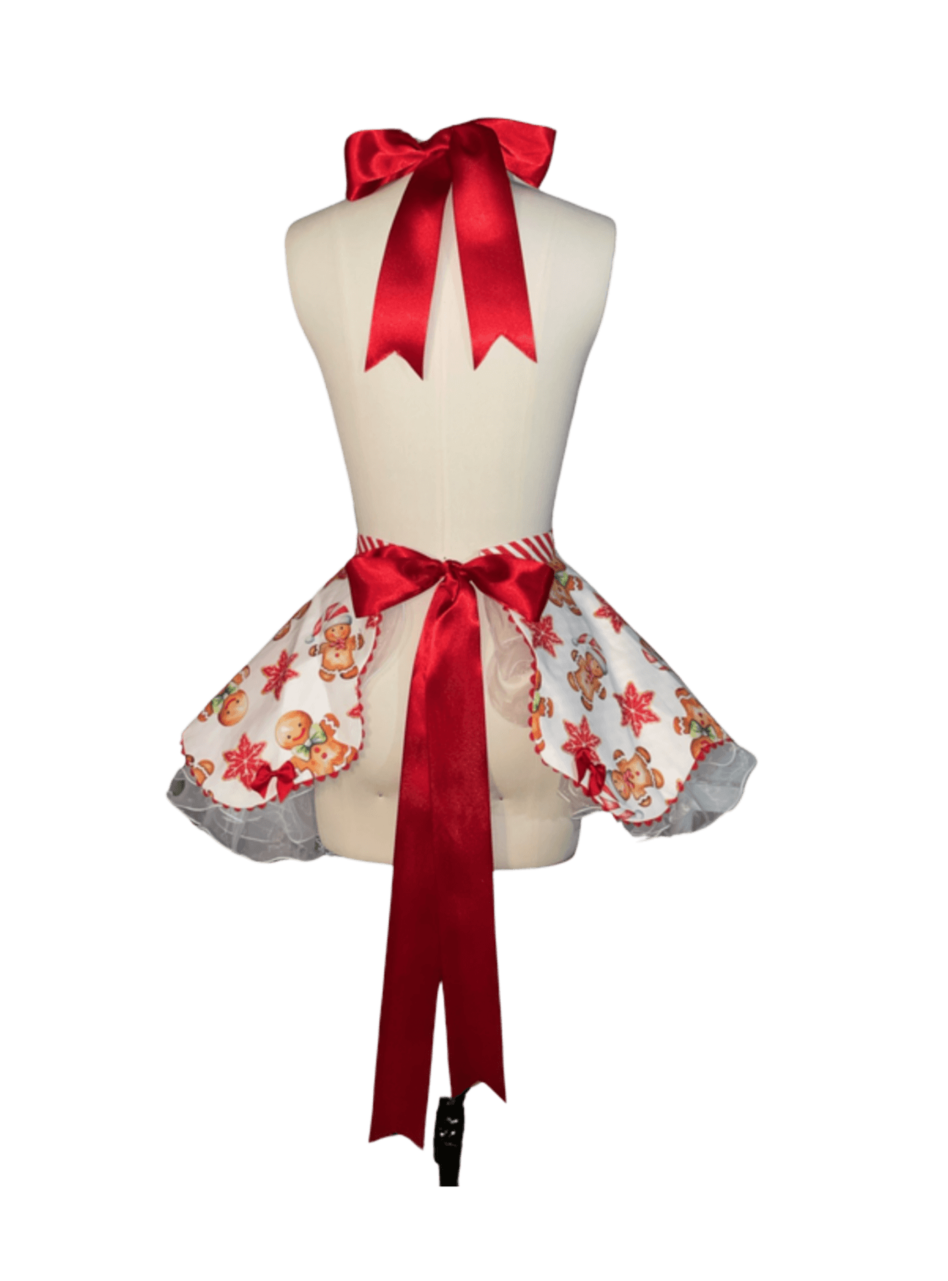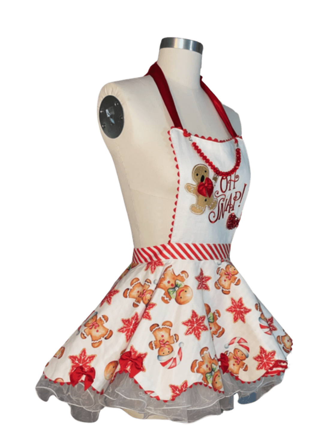 'Oh snap' into the world of holiday baking. Feast your eyes upon this captivating apron, designed for the chic cookie artist ready to lead a lively cookie party. Meticulously crafted from exquisite Linen Cotton Fabrics by the skilled artisans of Couture Aprons, this creation features a detachable, intricately beaded necklace embellishing its bib, showcasing exquisite embroidery. For a playful touch, an organza ruffled underskirt allows you to twirl with charm. Match this charming attire with a crimson dress and scarlet heels, and you will exude elegance at any festive gathering.
