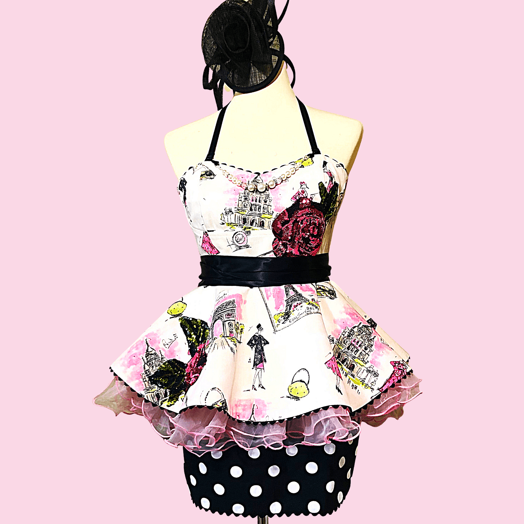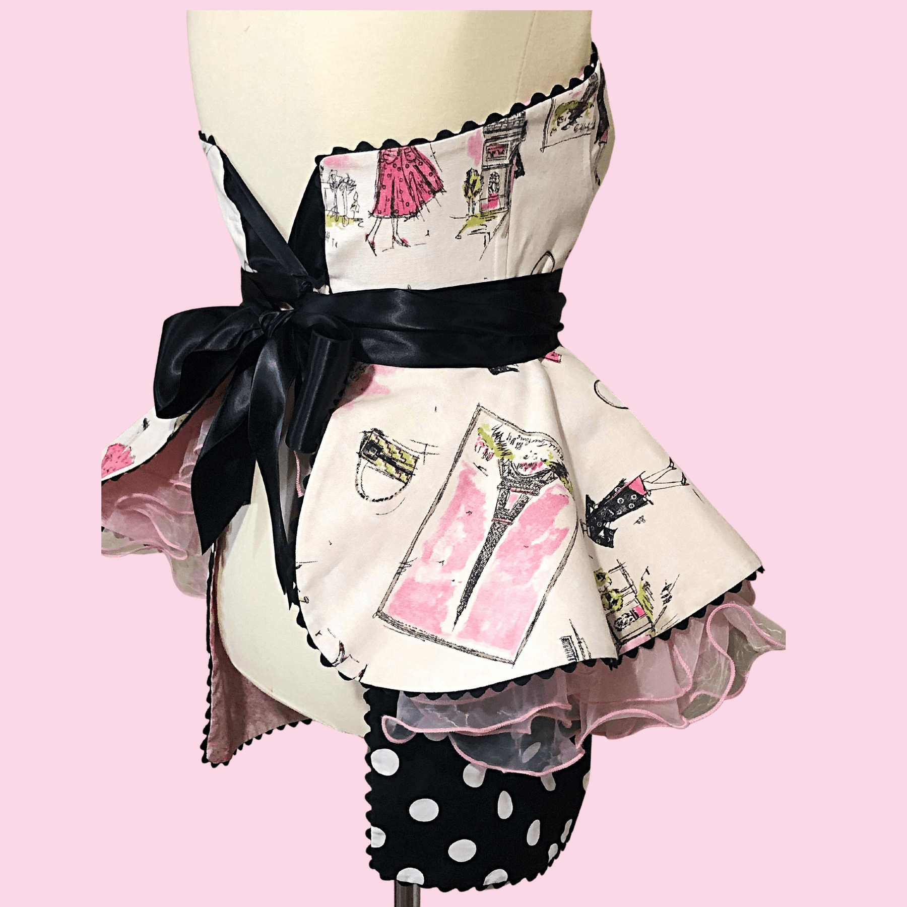 I Love Paris and Chanel - Flirty Couture Apron with ruffle organza underskirt mixed with Black and White Polka Dot underskirt with side pockets. Double face satin ribbon ties and a detachable neckband - finished with a classy handcrafted detachable necklace and sequin rose embroidery embellishments Fully Lined - 100% Cotton Fabrics - Handmade in the USA.
