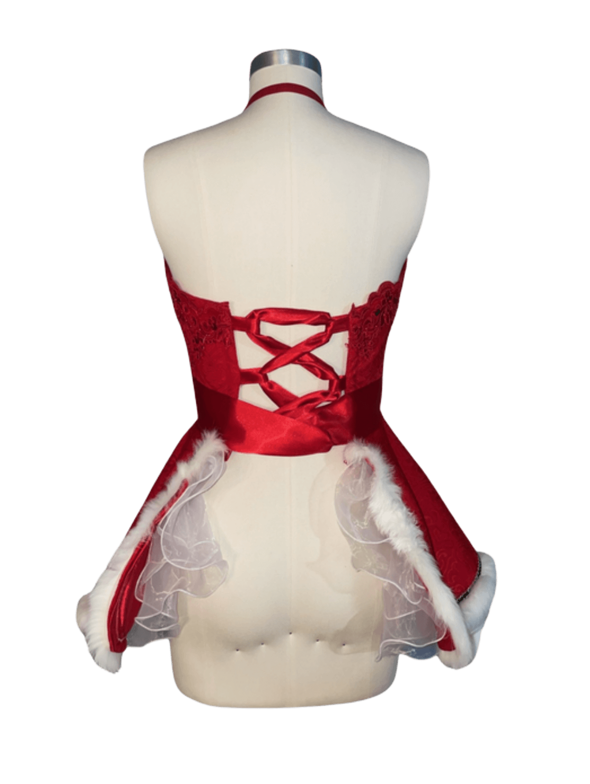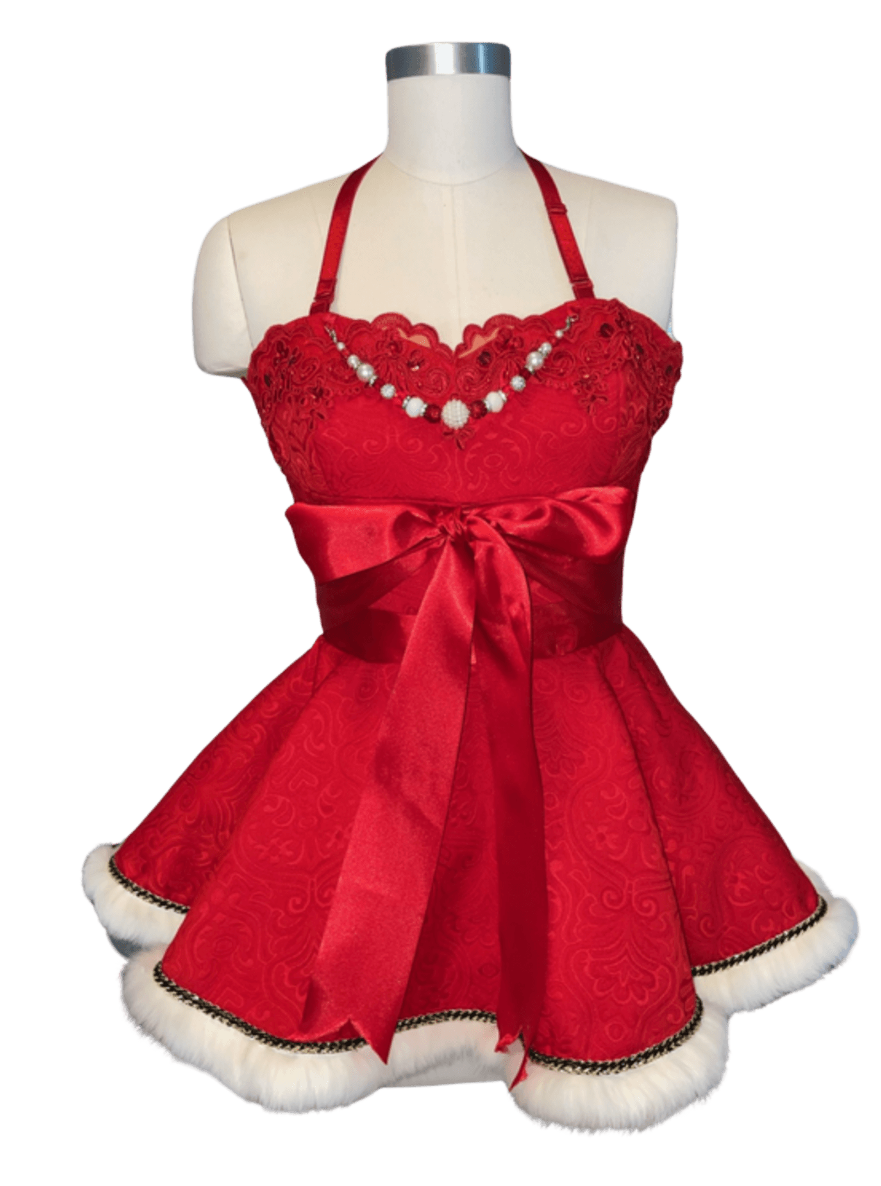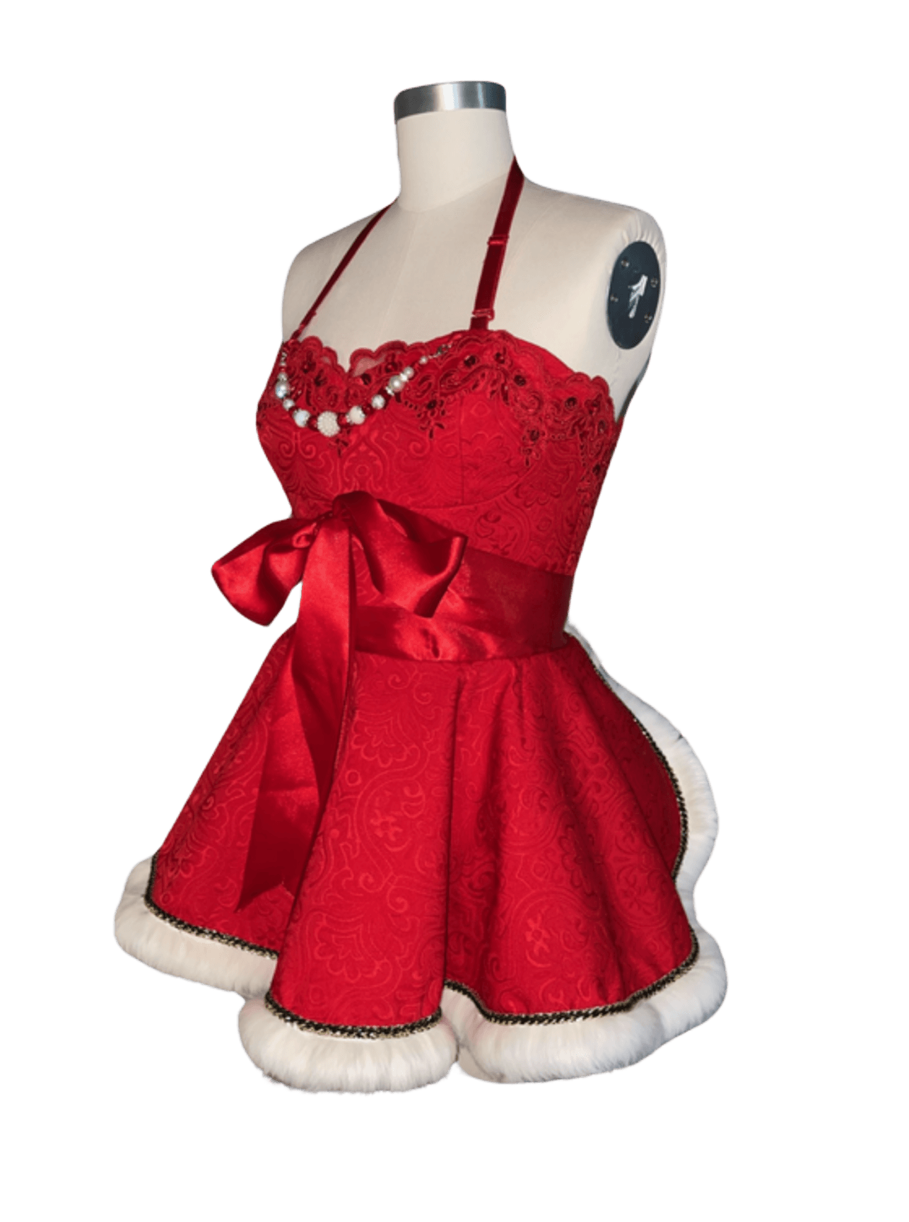 In the realm of festive enchantment, kindle the yuletide spirit with the Santa Baby Apron. Delight in the art of gift wrapping, savoring hot cocoa, indulging in specialty drinks, and crafting cookies. At Couture Aprons, we champion the art of hosting in grandeur. Crafted from Italian Viscose Brocade, adorned with scalloped red lace, faux white fur, and graced with a ruffled organza underskirt for a touch of whimsy. Adorned with a bespoke detachable beaded necklace, tailored exclusively for Santa Baby. This masterpiece is fully lined, featuring a double-faced satin ribbon that dances in a crisscross at the back, culminating in a lavish bow at the front.