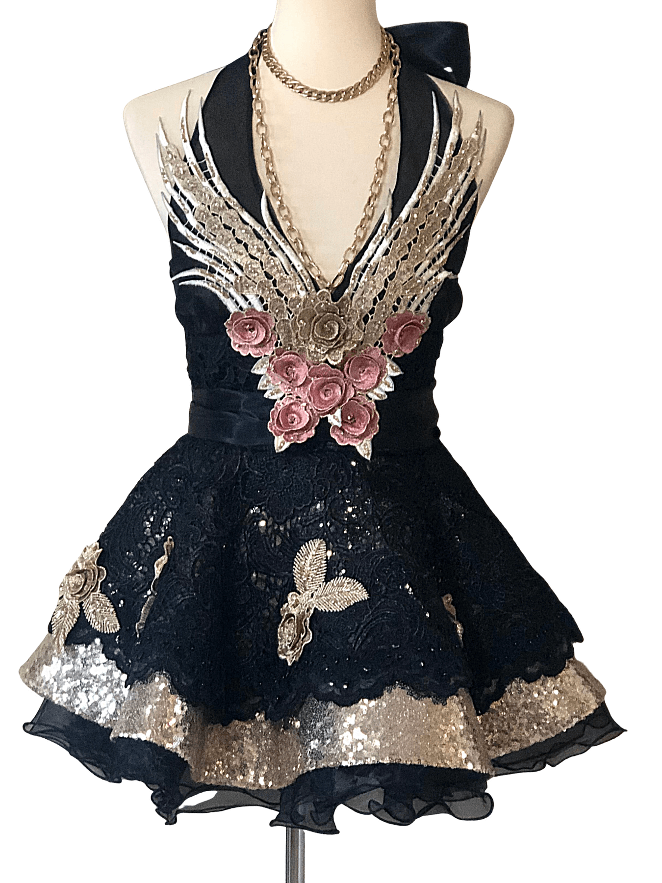 Sparkle while wearing Couture Aprons Luxury Hostess Apron. Angel Wings hand sewn on the front of Apron Dress with 3-D Rose Appliques. Sheer Black Silk Organza Halter top with detachable chain necklace. Guipure French Venice Lace peplum and sequin peplum under. Finishes with a ruffled organza underskirt for the final kick to its beauty. Black Double Faced Satin Ribbons.