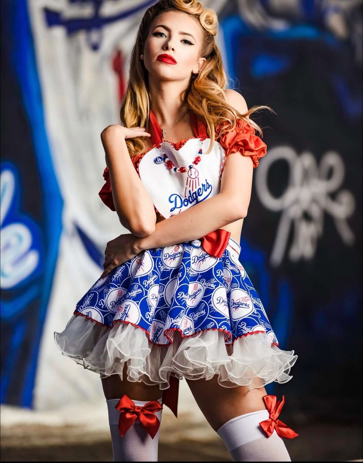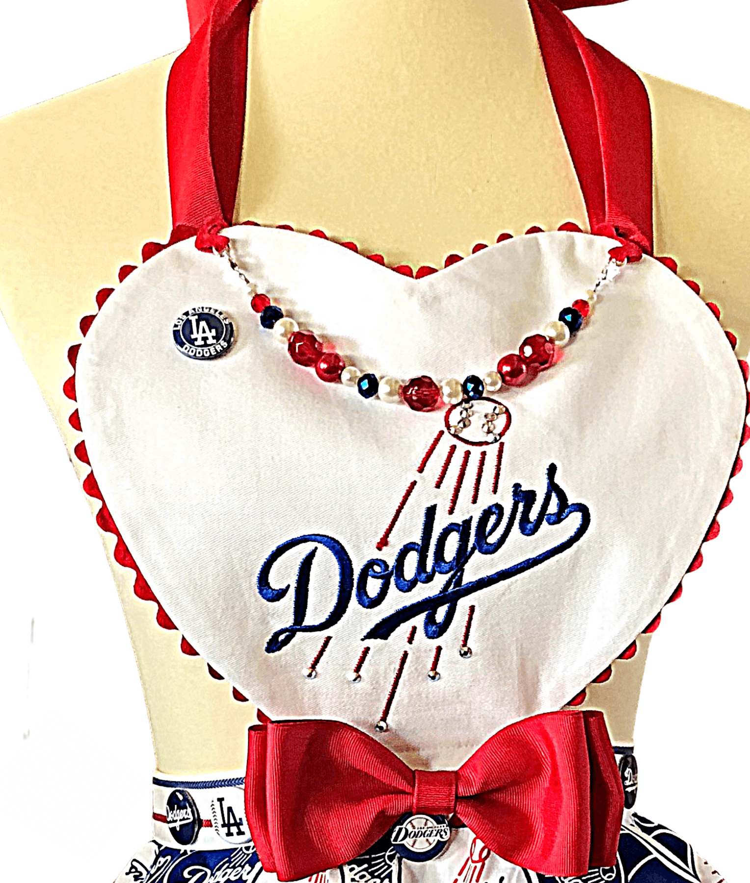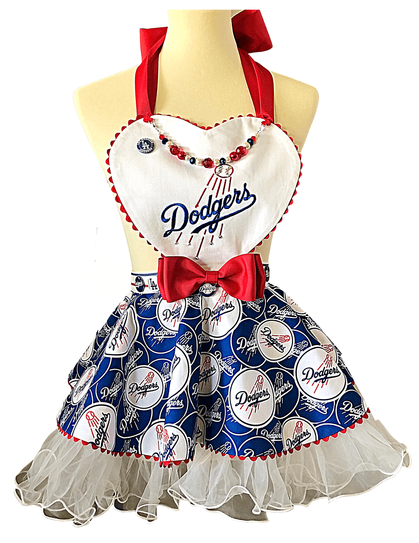 Order your Custom Team Apron Today! Vintage Style Fancy Aprons for the Sporty Chic, Who is the Biggest Fan?! Love LA Dodgers, then order your apron today! - 100% Cotton and Linen fabrics with professionally embroidered bib and Grosgrain Ribbon Ties - Ruffled Organza Underskirt - At Couture Aprons, we believe in embellishments, so we added fun team logo buttons, crystals, ribbon accent bow, and a handcrafted detachable necklace. The apron is lined with contrasting fabric. Go to Custom Order and submit your request for your favorite team!