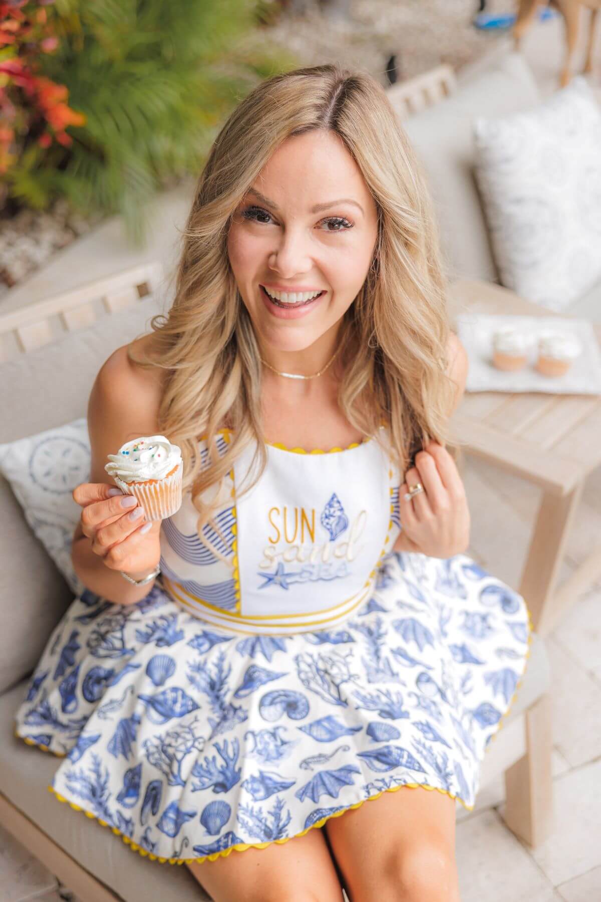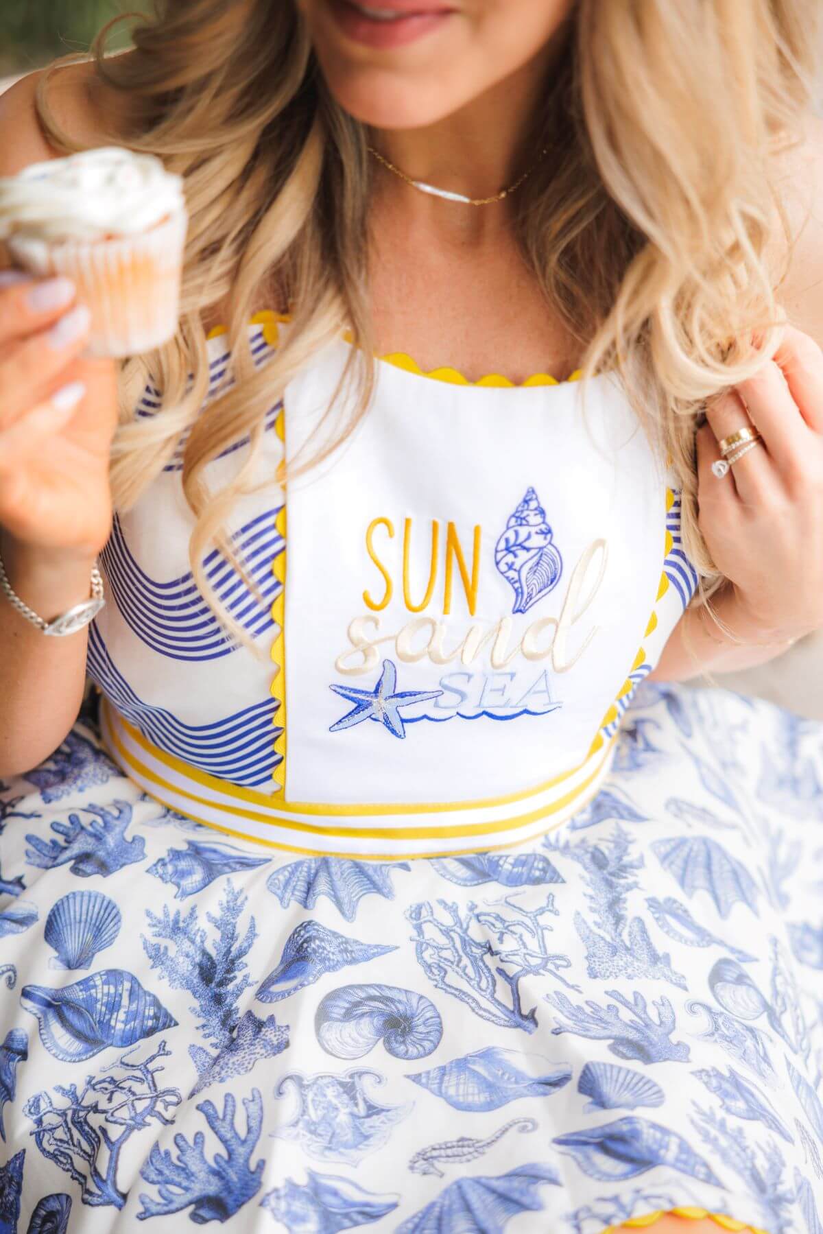 Behold the exquisite Sun, Sand, and Sea Hostess Apron by Couture Aprons.