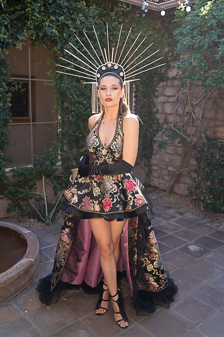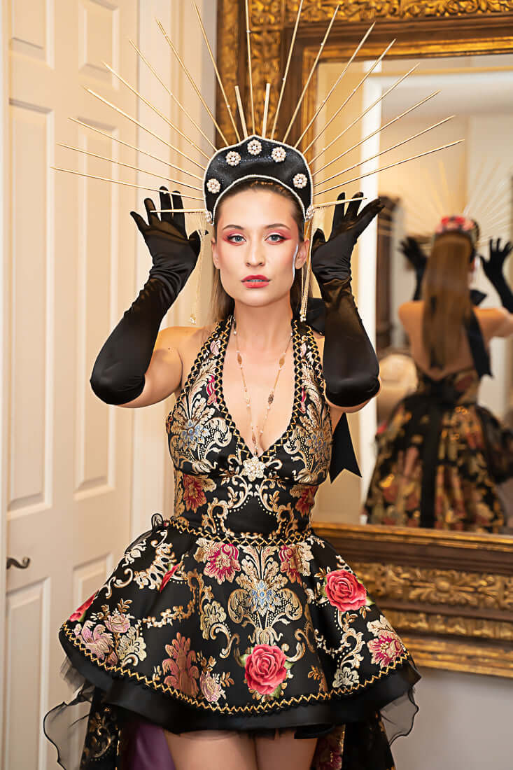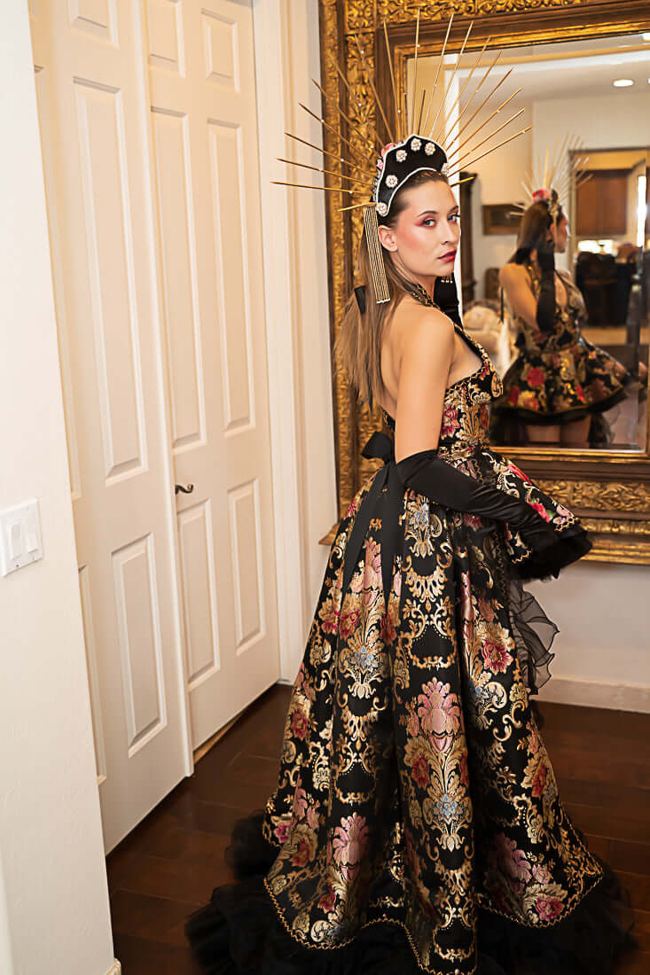 Luxury Couture Event Apron - The Empress is a statement piece designed for the lady who enjoys luxury. Fashion and Style makes this apron stand out - Italian Brocade with rose appliques, gold and black braid trim, satin lining and custom handcrafted detachable jewelry comes complete with Organza and tutu underskirts and matching train - grosgrain ribbon ties-Handmade in the USA.