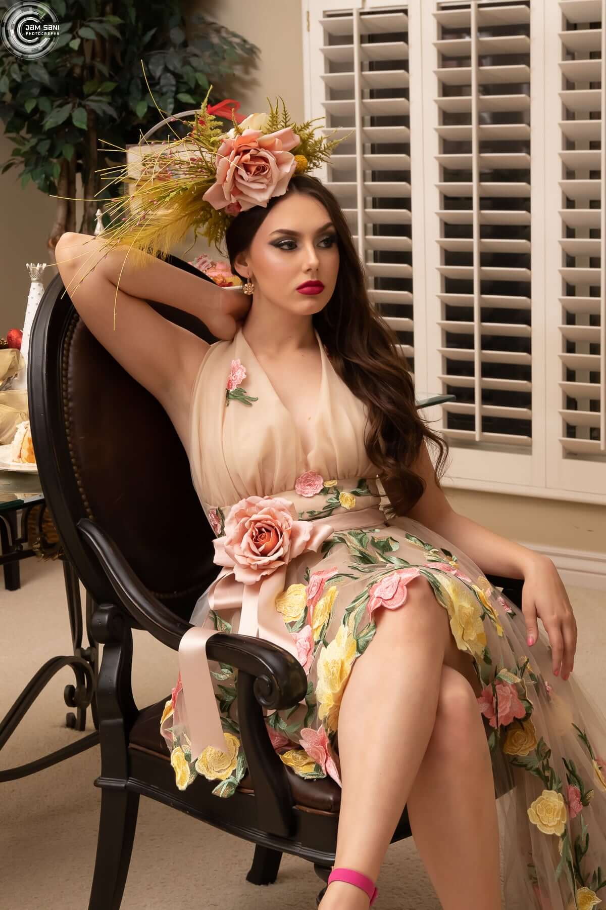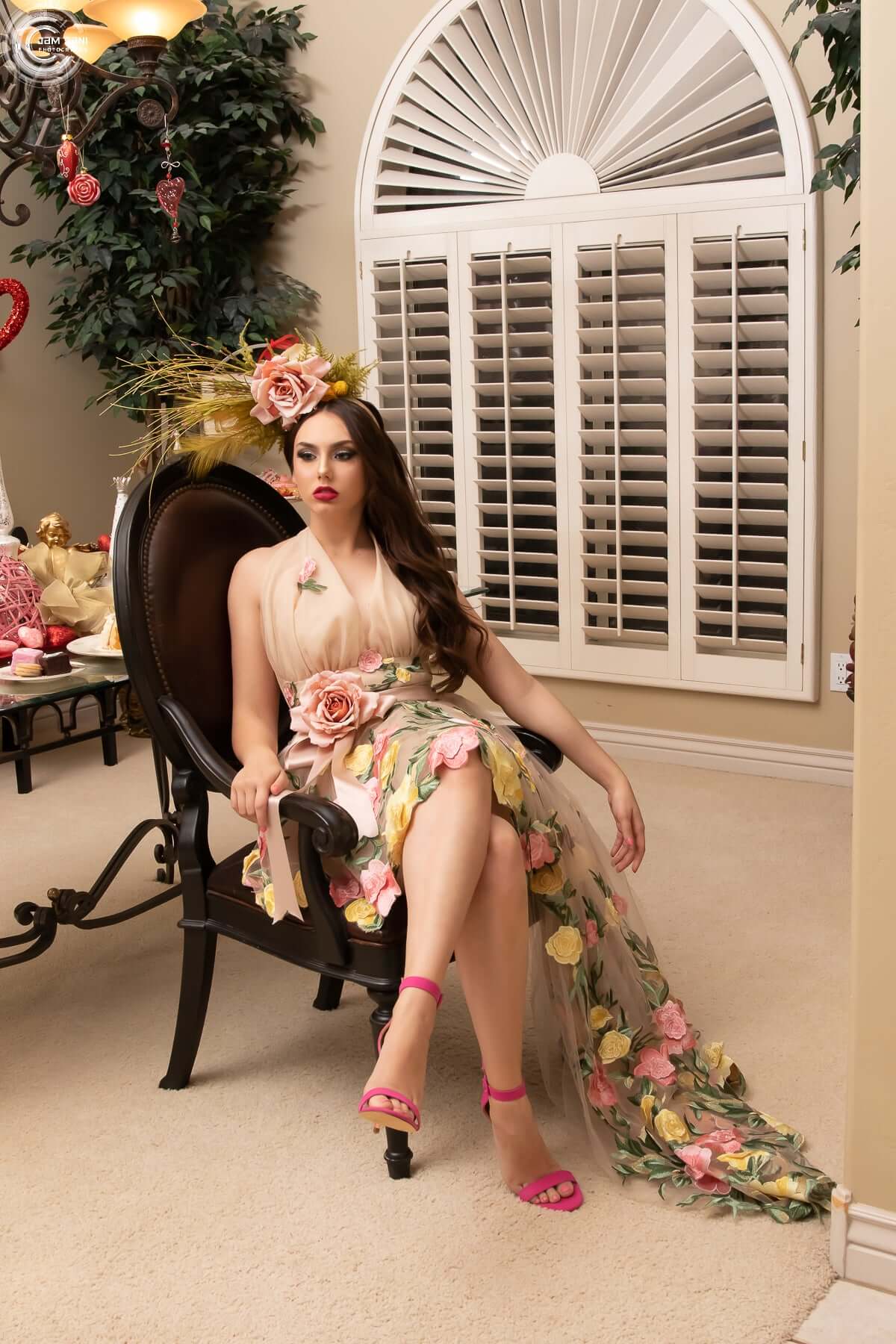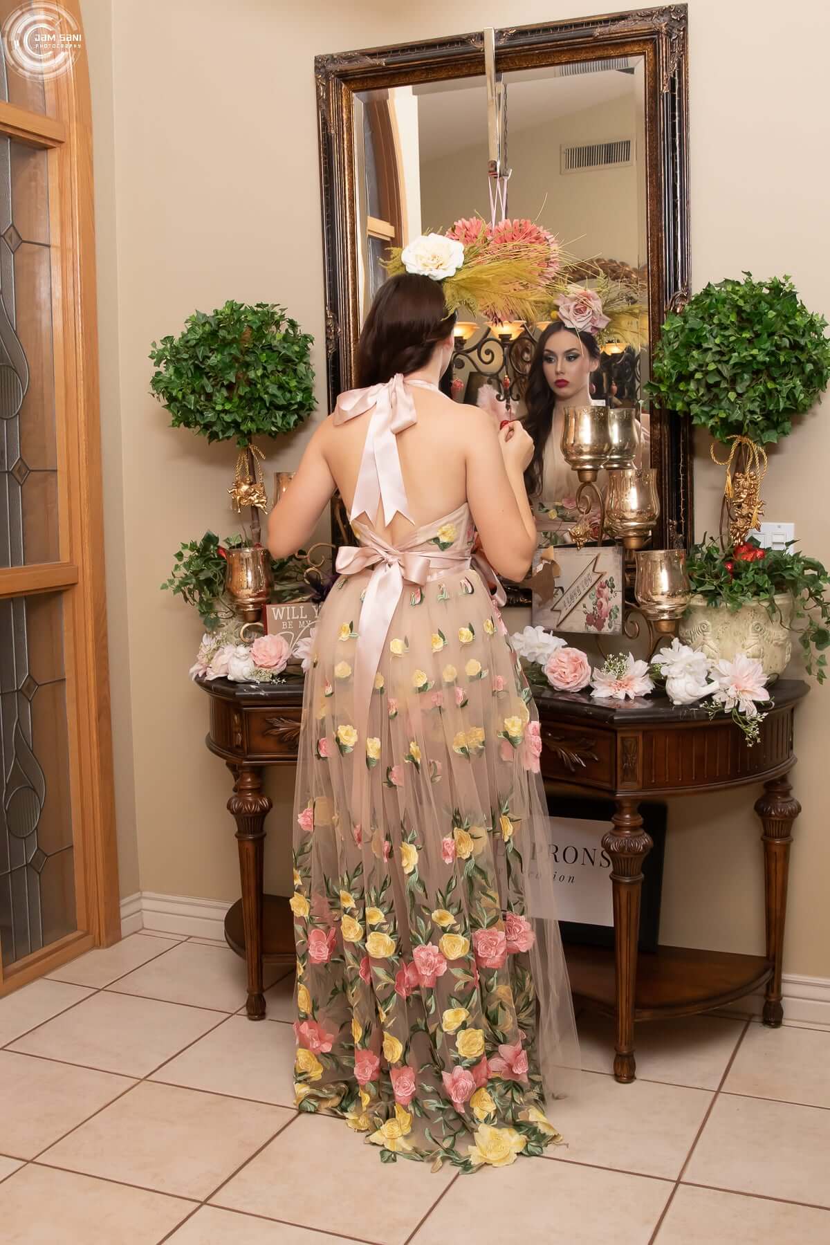 Luxury Italian Renaissance Hostess Apron at Couture Aprons for every occasion. Imported Italian Designer 3-D net fabric from Italy, lined with Organza layers. 1950's halter top enhances the bust with Romantic notes. Hear the harmony of the sweet whispers of the garden singing. Lovely from every angle that you'd be seen in, plus its comes with a graceful flowing detachable train. Trimmed with blush pink double faced satin ribbon ties and floral brooch.